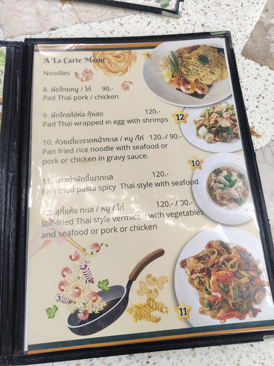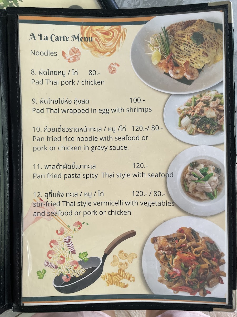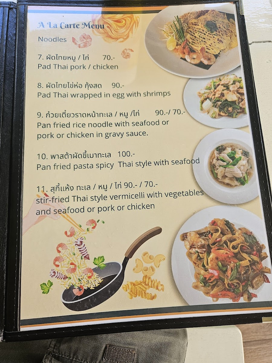 Guests can expect comforting plates like Pad Thai wrapped in egg with shrimp or rice topped with stir-fried Thai basil, alongside unique local specialties such as fried jellyfish and spicy pan-fried seafood pasta. Many dishes are served with a traditional Thai omelette, offering a familiar and satisfying touch that complements the fresh, vibrant flavors.